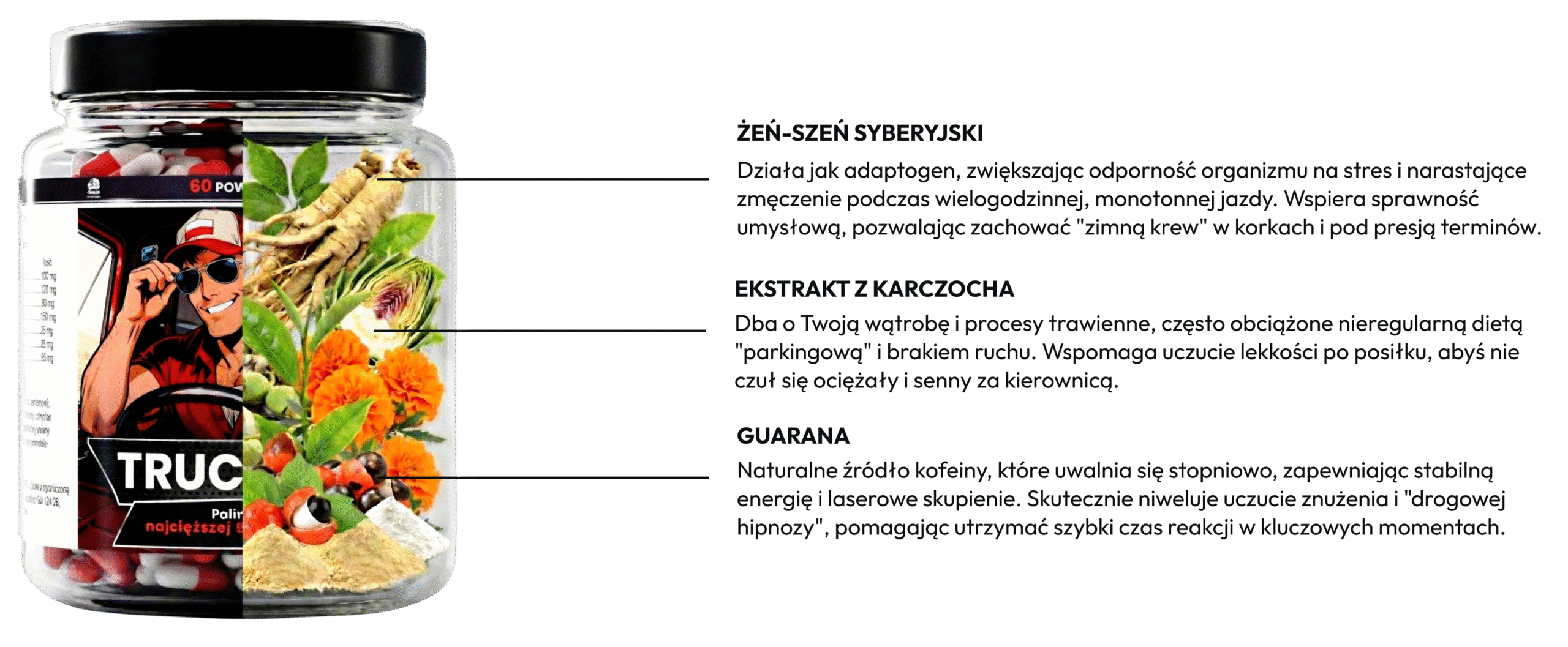 TRUCKER to czysta moc natury i konkretny skład. Precyzyjne połączenie standaryzowanych ekstraktów roślinnych, minerałów oraz witamin - bez zbędnych dodatków. Każdy składnik, od pobudzającej Guarany po chroniącą wzrok Luteinę, został starannie dobrany, by działać synergicznie i wspierać organizm kierowcy w najtrudniejszych warunkach drogowych. Suplement w formie wygodnych kapsułek produkujemy z pełną kontrolą nad każdym etapem - od selekcji surowców po finalne napełnienie słoika, zapewniając Ci pewne wsparcie w kabinie i na każdej trasie.